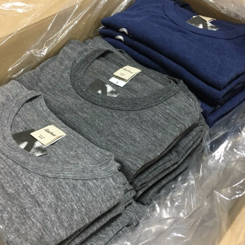 まず、このTシャツは「グレー x 黒、チャコール x ストロー、ネービー x 白」の3色あります。写真のものはチャコール x ストローになります。ボディはビンテージの雰囲気をモチーフとし、コットン・ポリエステル・レーヨンの3種類の糸をブレンドした素材を使っています。見た目は落ち着いていて、ナチュラルな雰囲気も併せ持った感じです。ブレンドした素材が肌触りが良いので、着心地も軽く着ていてすごく気持ち良いです。軽い素材の割には耐久性があるので、長く着てその風合いを楽しんでもらうのも面白いかなと思います。