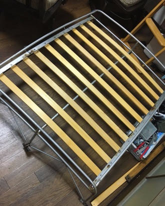 前回の続きです。結局全ての板を作り直すことになり、仕事が終わってから地味に作業を続け完成しました。写真の状態は仮組みの状態です。板を止めていたリベットもボルトに変えたので、板の付け外しはとても簡単になりました。